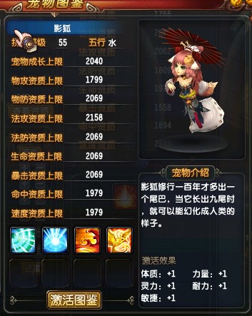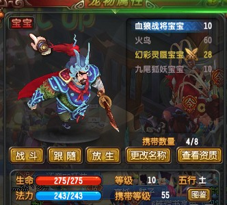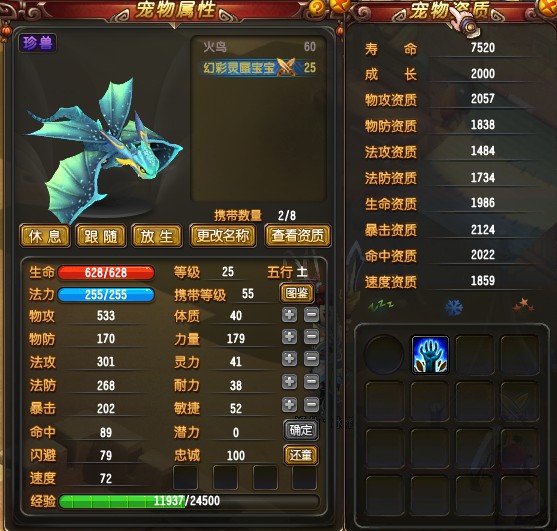 这里就以我合出来的珍兽举例吧,55级珍兽属于物资高,法资低的宝宝,属于物攻类的宝宝。我参与合成的宝宝是影狐宝宝和精卫宝宝。