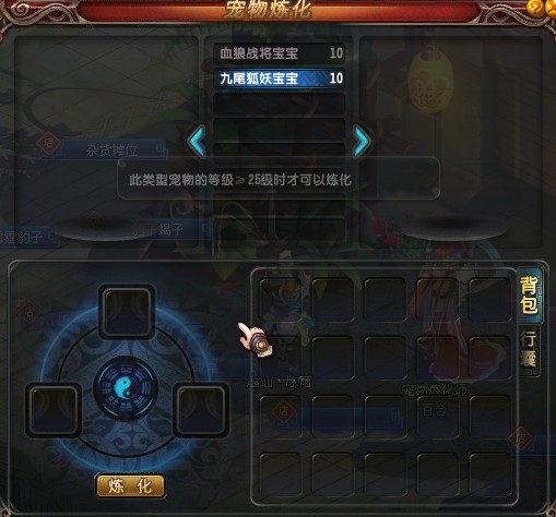 然后到天下城的宠物炼化师百合处,先购买3颗与要参与合成的宝宝五行属性一样的炼化丹