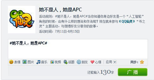 《QQ仙灵》开启“书之灵”微小说大赛,玩家在腾讯微博话题#她不是人,她是APC#发布作品,并收听《QQ仙灵》官方微博,即可成功参与比赛。