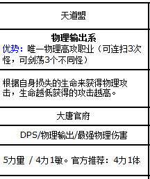 属性点全部加力量,别问为啥。不要相信什么需要敏捷和体力之类的。5力到底吧,觉得自己比较脆了?去找鉴定师,花点经验和钱就可以把血线拉上 来。所以就5力到底吧,而且5力的天道盟,到了30级以后,把剑阵四方点触来,一单自己血低于50%,那就是秒三啊。而且在前期PK,3连妙人没压力啊。 谁能伤的起啊~~